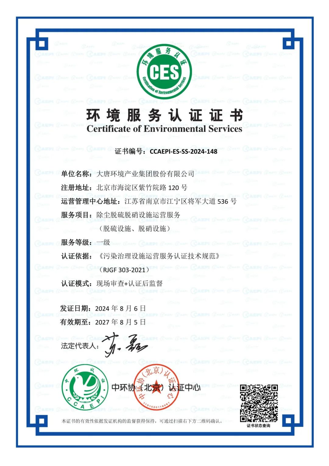 本网讯 10月14日,388vip太阳集团特许经营分公司收到中环协(北京)认证中心颁发的“除尘脱硫脱硝设施运营服务”一级服务认证证书。这一殊荣不仅是对环境公司及分公司在脱硫脱硝领域专业能力的肯定,更是对其长期致力于环境保护事业、推动绿色可持续发展努力的认可。