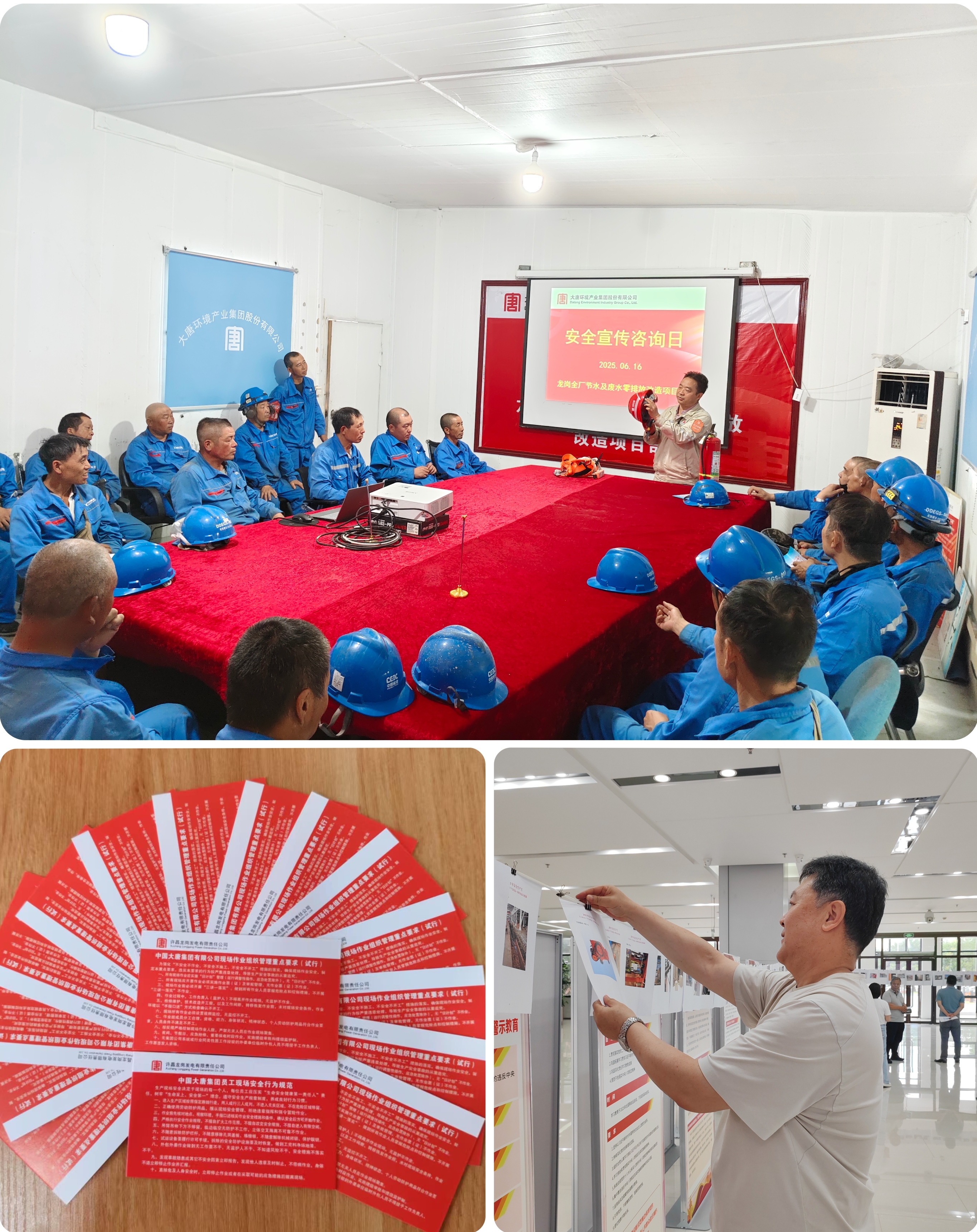 在项目,许昌龙岗节水及废水零排放项目人员组织了安全知识讲解活动,现场对安全帽、灭火器等常用安全防护用品和消防器材的使用方法进行了详细讲解与示范培训。同时制作了员工行为规范“两个十条”红卡片,卡片内容简洁凝练,便于员工随身携带、随时查阅,时刻提醒自身遵守安全规范。南京环保装备公司污水处理项目则通过组织观看主题宣教片和发放安全科普资料的方式,为员工送上了一堂安全知识课,发放的安全科普资料内容丰富、实用性强,涵盖了安全生产的各个方面,为员工提供了全面的安全知识参考。