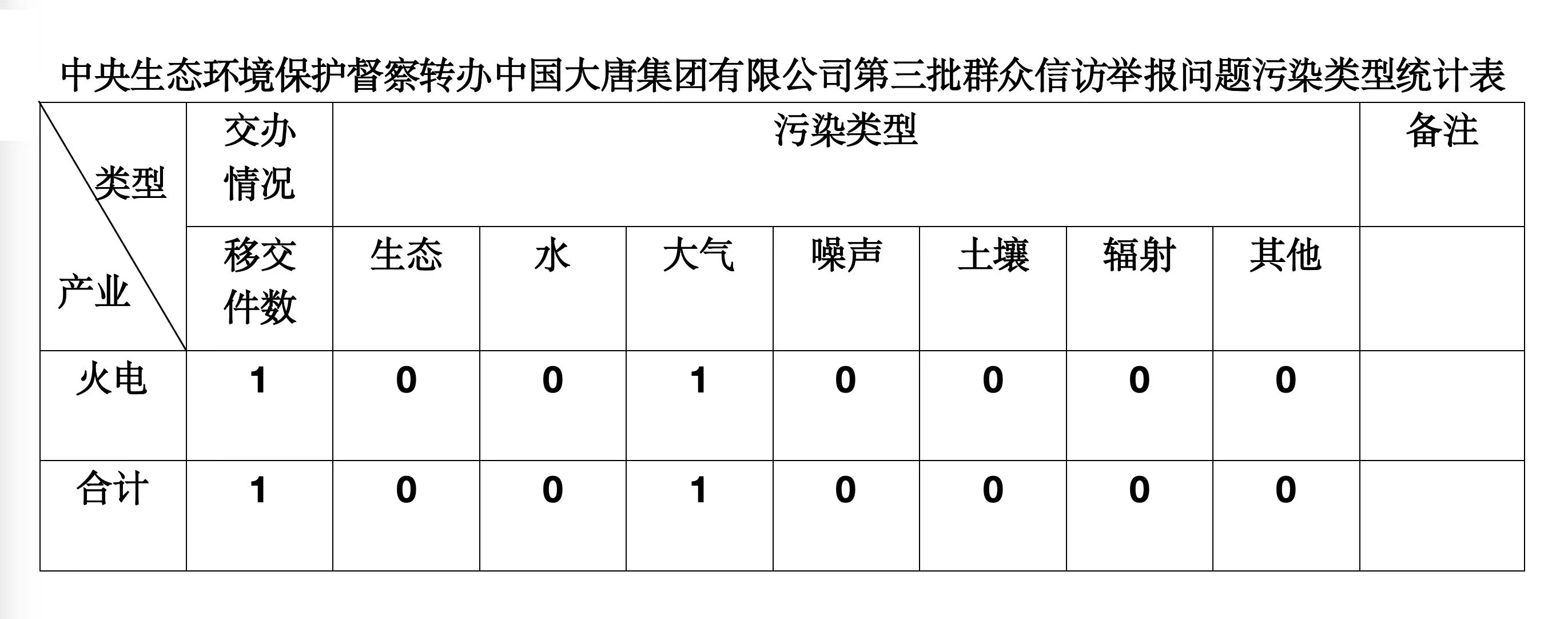2025年6月5日,中央第七生态环境保护督察组向中国大唐集团有限公司移交第三批群众信访举报件,共计1件,为来电举报,涉及大气问题1个。所有举报件办理工作已第一时间进入调查核实办理程序,办理情况将按照相关要求反馈督察组,并及时向社会公开。