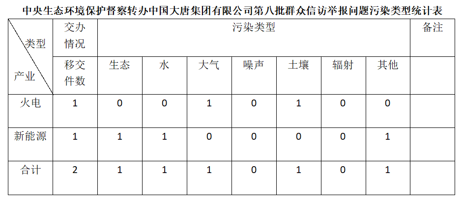 2025年6月11日,中央第七生态环境保护督察组向中国大唐集团有限公司移交第八批群众信访举报件,共计2件,均为来电举报,涉及生态问题1个、水问题1个、大气问题1个、土壤问题1个、其他问题1个。所有举报件办理工作已第一时间进入调查核实办理程序,办理情况将按照相关要求反馈督察组,并及时向社会公开。