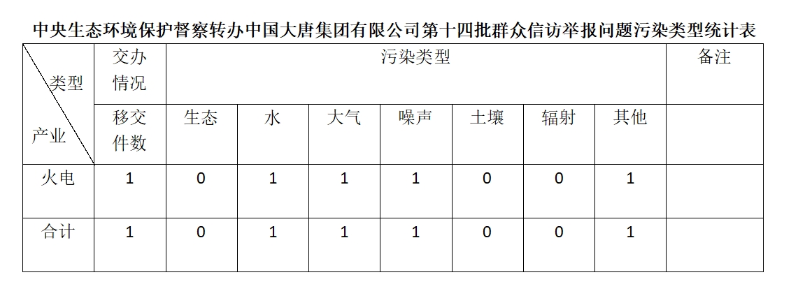2025年6月20日,中央第七生态环境保护督察组向中国大唐集团有限公司移交第十四批群众信访举报件,共计1件,为来电举报,涉及水问题1个、大气问题1个、噪声问题1个、其他问题1个。所有举报件办理工作已第一时间进入调查核实办理程序,办理情况将按照相关要求反馈督察组,并及时向社会公开。
