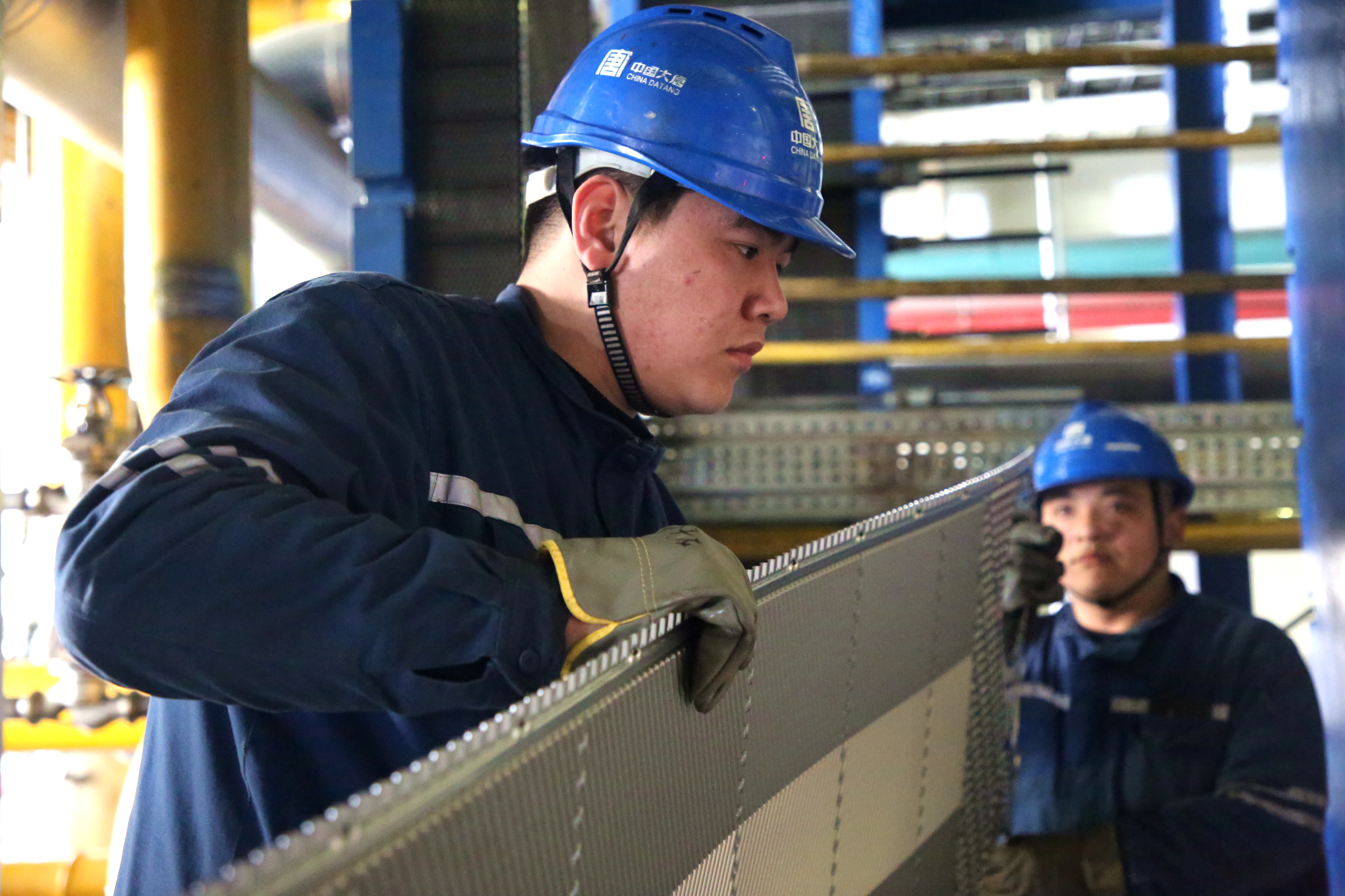 经验丰富的高级检修工孙辉冲锋在前:“冷油器体积大,上下一起松螺栓更好拆卸,我和林博在脚手架上各松一边,家宁和松奇负责下面,其余人在旁边扶好。”脚手架虽高,站在上面也只能勉强够到冷油器顶端,高空作业更是不便。