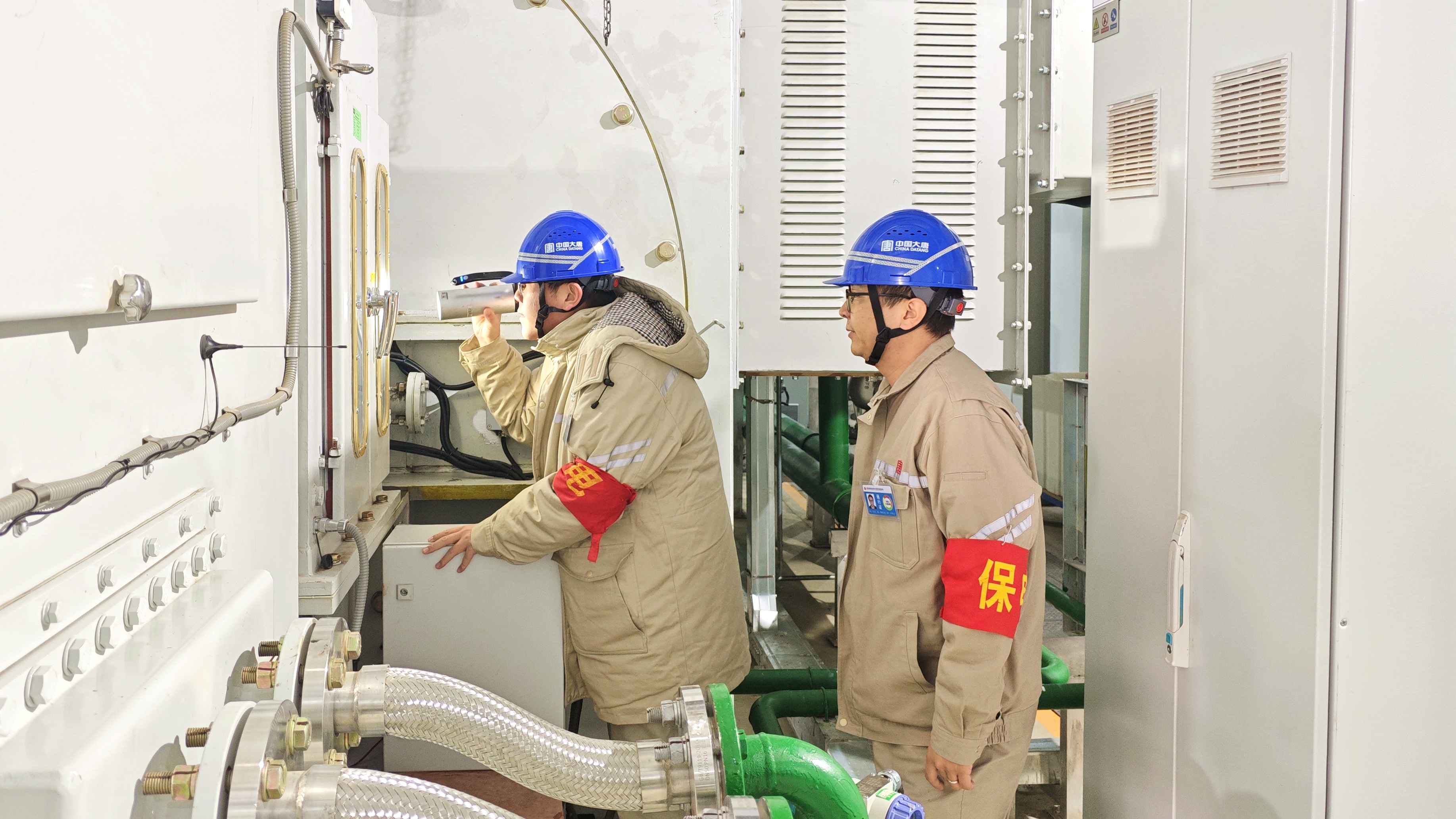 随后,俩人沿着错综复杂的冷却水管路检查。薛立波蹲下身子,仔细观察水管的连接处,用手电筒照亮每一个缝隙,查看是否有渗漏迹象。侯杰则在一旁用测温枪测量水管表面温度。