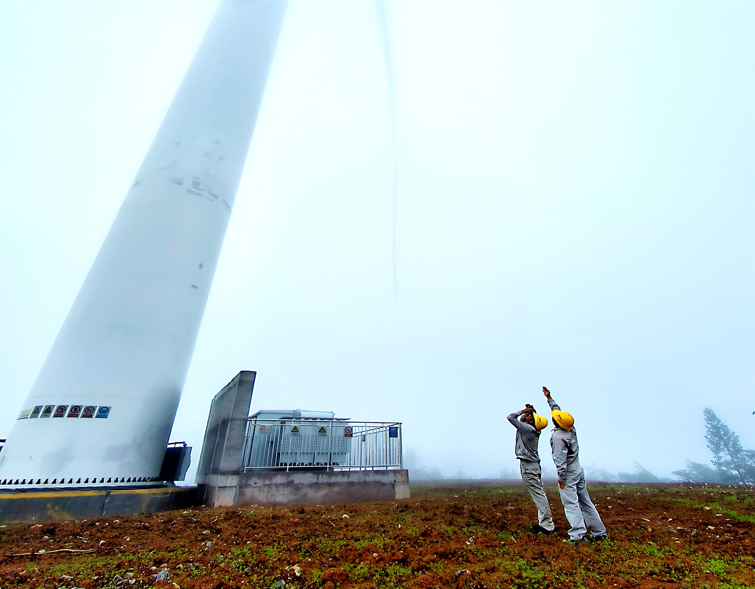 一阵山风吹来,站在风机塔下,几个人都不由自主地紧了紧身上的大衣。云雾迅速流动了起来,风机的三个叶片和整个塔筒,慢慢从云雾中露出了“真容”。